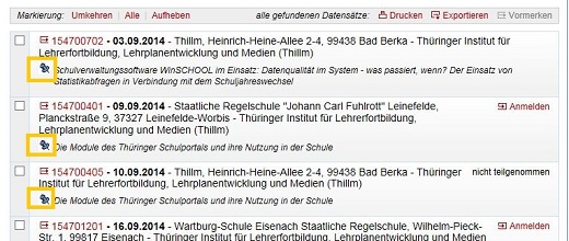Die Funktionen DRUCKEN und EXPORTIEREN von Veranstaltungen aus der Trefferliste des Veranstaltungskatalogs stehen allen Nutzerinnen und Nutzern im Schulportal zur Verfügung.