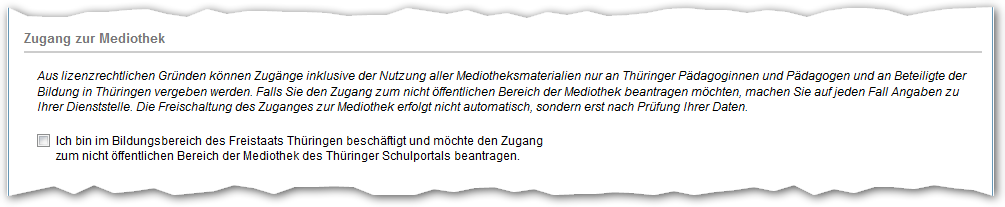 "Ich bin im Bildungsbereich des Freistaats Thüringen beschäftigt und möchte den Zugang zum nicht öffentlichen Bereich der Mediothek des Thüringer Schulportals beantragen."