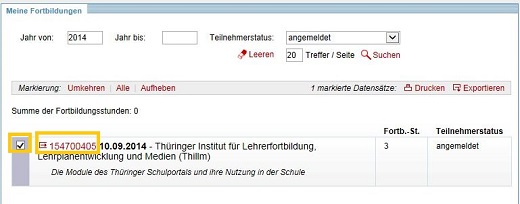 Nach dem Betätigen des Links SUCHEN erscheinen alle Fortbildungen in der Trefferliste, auf die die gewählten Suchkriterien zutreffen. Mit den Funktionen DRUCKEN und EXPORTIEREN können alle Fortbildungen oder eine Teilmenge aus der Trefferliste über ein pdf-Dokument gedruckt oder in einer Exceldatei (Format xls) zusammengestellt werden. Die genannten Funktionen berücksichtigen bei Markierung einzelner Fortbildungen nur diese. Wählen Sie hier keine konkrete Veranstaltung aus, wird die gesamte Trefferliste umgesetzt.