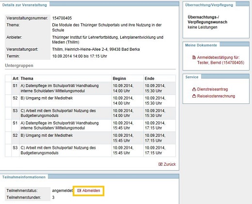 In der Darstellung werden Details der Veranstaltung ggf. mit der Wahl von Untergruppen, Ihre Angaben zu Übernachtungs- und Verpflegungsleistungen aus der Anmeldung, zugehörige Dokumente und Teilnahmeinformationen angezeigt.