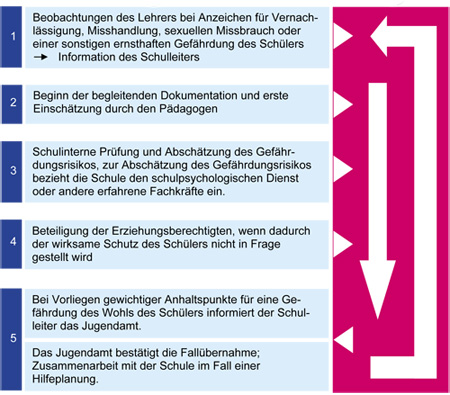 "Werden in der Schule Anzeichen für Vernachlässigung, Misshandlung, sexuellen Missbrauch oder eine sonstige ernsthafte Gefährdung des Wohls eines Schülers wahrgenommen, so hat die Schule dem nachzugehen. Zur Abschätzung des Gefährdungsrisikos bezieht die Schule den Schulpsychologischen Dienst oder andere erfahrene Fachkräfte ein. Die Eltern sind zu beteiligen, wenn dadurch der wirksame Schutz des Schülers nicht in Frage gestellt wird. Bei Vorliegen gewichtiger Anhaltspunkte für eine Gefährdung des Wohls eines Schülers informiert die Schule das Jugendamt. Die Schule unterstützt im Rahmen ihres Bildungs- und Erziehungsauftrags die vom Jugendamt oder anderen Stellen angebotenen Hilfen."