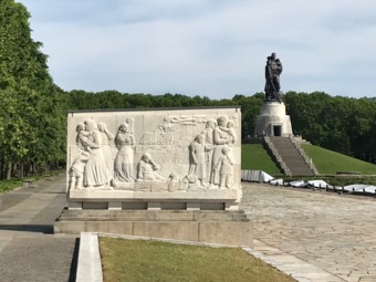 Das Sowjetische Ehrenmal ist eine Gedenkstätte und ein Soldatenfriedhof im Treptower Park in Berlin. Die im Mai 1949 fertiggestellte Anlage wurde auf Weisung der Sowjetischen Militäradministration in Deutschland errichtet, um die im Zweiten Weltkrieg gefallenen Soldaten der Roten Armee zu ehren. Es wurden ca. 7000 der in der Schlacht um Berlin gefallenen Soldaten hier bestattet. Ein breit angelegter, leicht ansteigender und von „trauernden“ Birken gesäumter Weg führt zum Hauptfeld der Gedenkstätte. Der Weg ist markiert durch zwei große, stilisierte Fahnen. An ihrer Stirnseite befindet sich jeweils die Skulptur eines knienden Soldaten in voller Montur und mit einer Maschinenpistole bewaffnet. Sechzehn weiße Sarkophage stehen entlang der äußeren Begrenzung. Sie sind auf den beiden Längsseiten mit Reliefs aus der Geschichte des Großen Vaterländischen Krieges der Sowjetvölker versehen und tragen auf der dem zentralen Feld zugewandten Schmalseite Zitate von Josef Stalin. Der zentrale Ort der Anlage wird durch eine auf einem Sockel stehende Skulptur „Der Befreier“ von Jewgeni Wutschetitsch gebildet. Die Figur stellt einen Soldaten dar, der in der rechten Hand ein Schwert und auf dem linken Arm schützend ein Kind trägt; ein Hakenkreuz zerbricht unter seinen Stiefeln. Die Skulptur ist 12 Meter hoch und 70 Tonnen schwer.