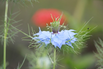 Das Foto zeigt eine Blüte der Jungfer im Grünen (Nigella damascena). Diese einjährige Pflanze aus der Familie der Hahnenfußgewächse kommt aus dem Mittelmeerraum und ist eine in Mitteleuropa häufig kultivierte Gartenpflanze. Das Bild ist unter CC0 lizenziert und kann somit frei verwendet werden.