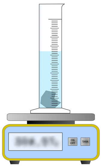 Das Bild gehört zur Serie "Chemie Grafiken". Es zeigt eine Waage mit Messzylinder, blauer Flüssigkeit und unregelmäßigem Körper. Das Bild ist unter CC0 lizenziert und kann somit frei verwendet werden.