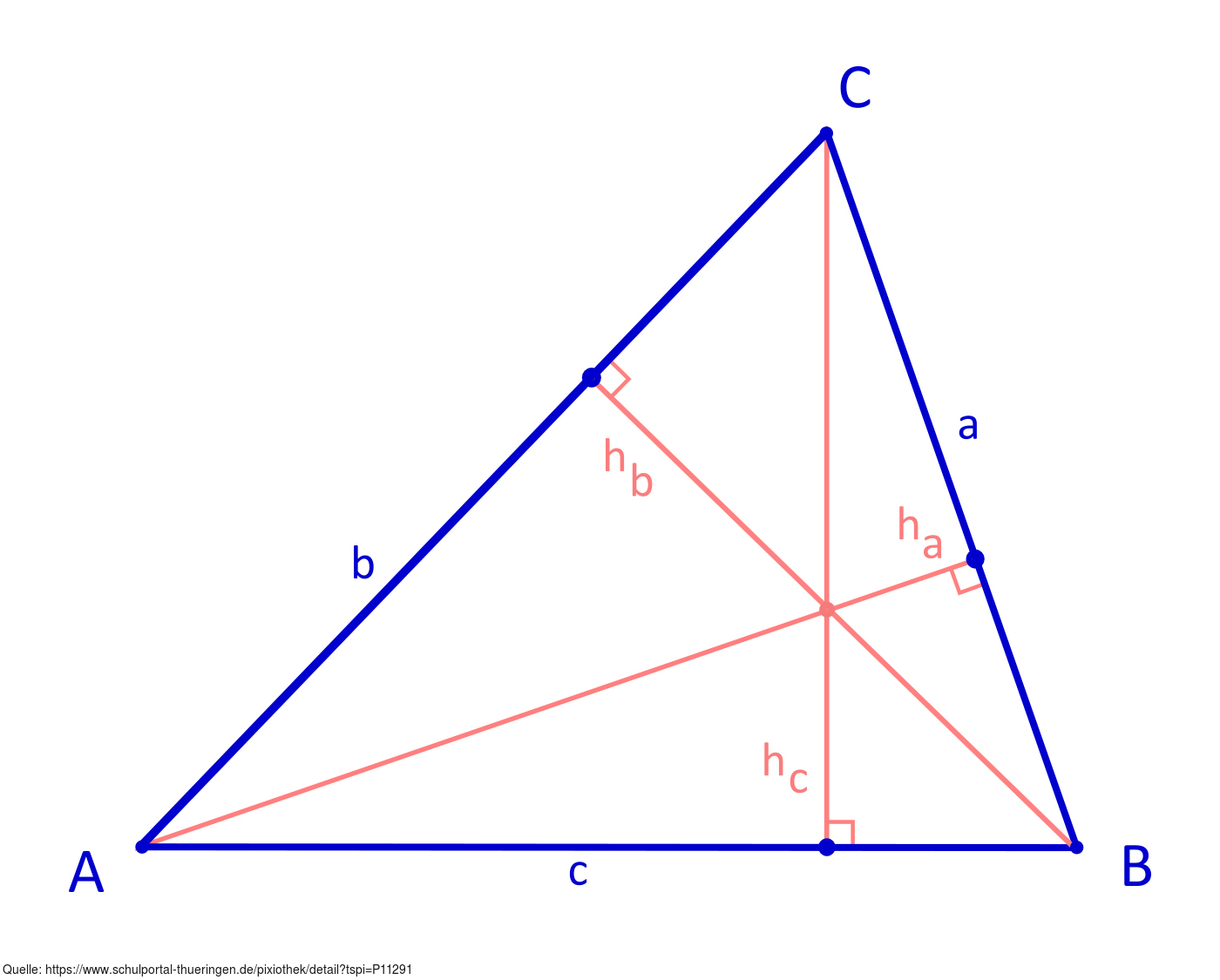 Das Bild gehört zur Serie "Mathematik Geometrie". Es zeigt die drei Höhen in einem spitzwinkligen Dreieck. Die Höhen schneiden sich in einem Punkt. Das Bild ist unter CC0 lizenziert und kann somit frei verwendet werden.