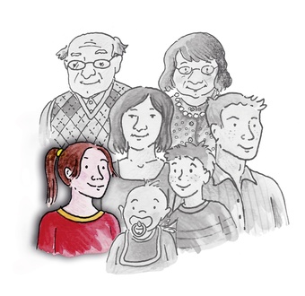 Das Bild gehört zur Serie "Familienmitglieder als Zeichnung". Es zeigt die Schwester im Kreise ihrer Familie. Es gelten die Nutzungsbedingungen der Mediothek und Pixiothek.