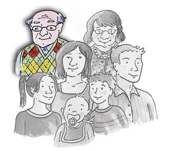 Das Bild gehört zur Serie "Familienmitglieder als Zeichnung". Es zeigt den Opa im Kreise seiner Familie. Es gelten die Nutzungsbedingungen der Mediothek und Pixiothek.