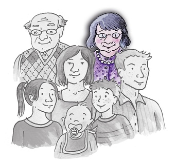 Das Bild gehört zur Serie "Familienmitglieder als Zeichnung". Es zeigt die Oma im Kreise ihrer Familie. Es gelten die Nutzungsbedingungen der Mediothek und Pixiothek.