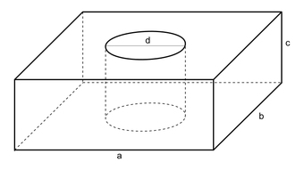 Das Bild gehört zur Serie "Geometrie Körper". Es zeigt eine kreisrunde Bohrung, die vollständig durch den Quader verläuft. Bei Vorgabe von Maßangaben für die bezeichneten Seiten kann das Volumen des Körpers berechnet werden. Das Bild ist unter CC0 lizenziert und kann somit frei verwendet werden.