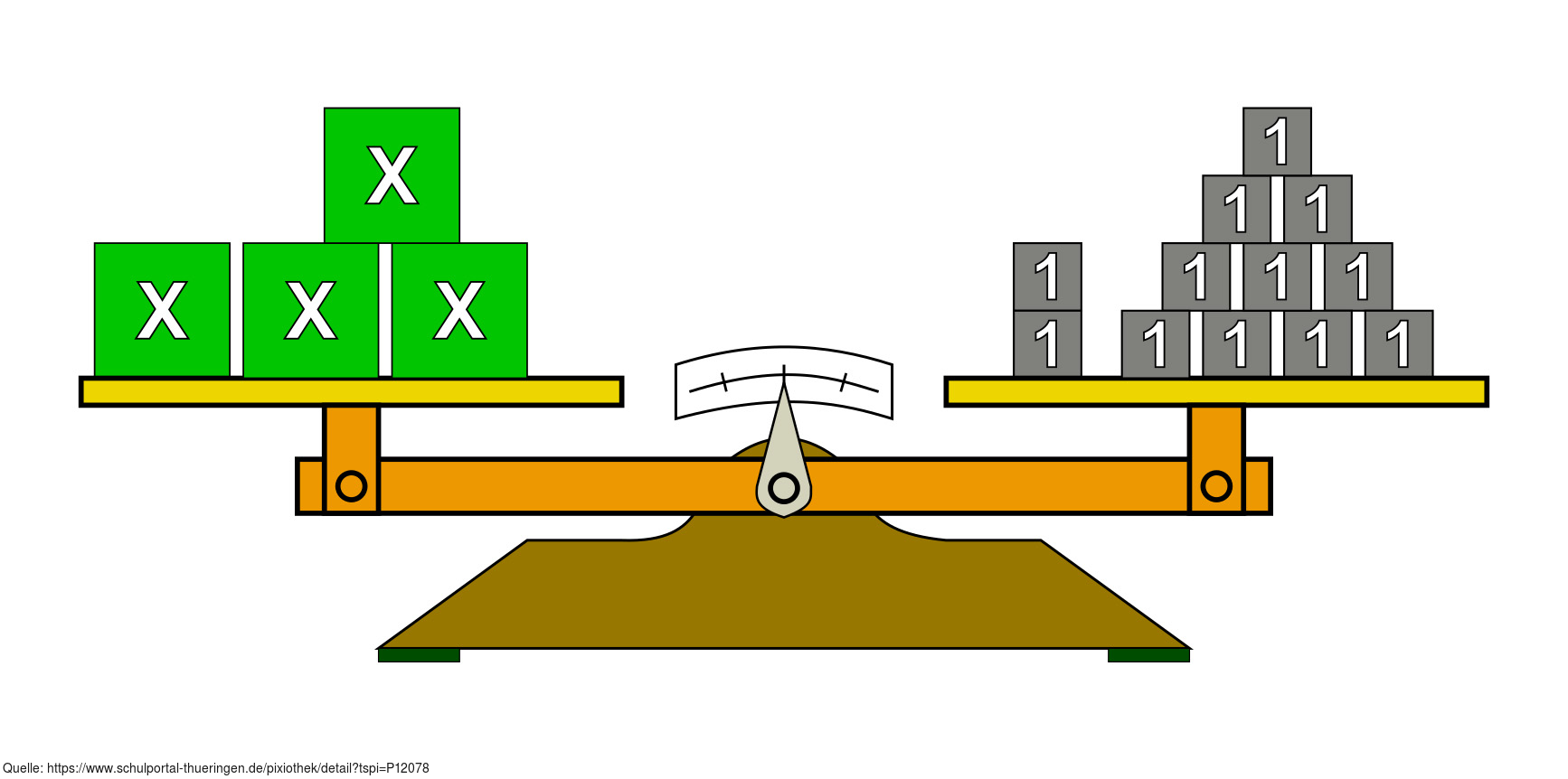 Das Bild gehört zur Serie "Mathematik, Gleichungen". Es veranschaulicht die Lösung einer linearen Gleichung durch Äquivalenzumformung mit dem Bild einer Waage. Zur Gleichung 26 (5x - 1 = x + 11) veranschaulichen die Bilder 26-1 bis 26-5 die Umformungsschritte. Das Bild ist unter CC0 lizenziert und kann somit frei verwendet werden.