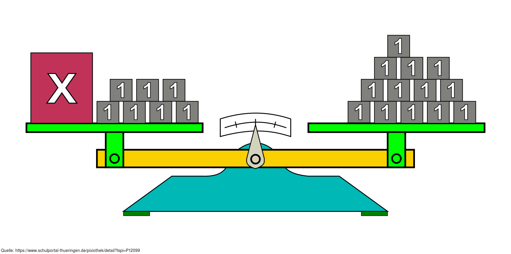 Das Bild gehört zur Serie "Mathematik, Gleichungen". Es veranschaulicht eine linearen Gleichung durch Körper auf einer Waage. Das Bild ist unter CC0 lizenziert und kann somit frei verwendet werden.