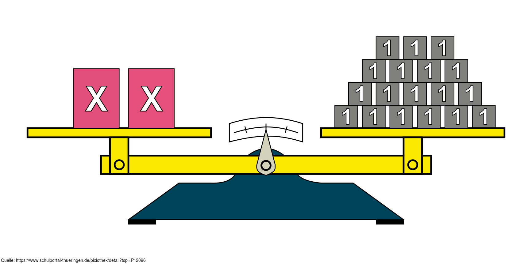 Das Bild gehört zur Serie "Mathematik, Gleichungen". Es veranschaulicht eine linearen Gleichung durch Körper auf einer Waage. Das Bild ist unter CC0 lizenziert und kann somit frei verwendet werden.