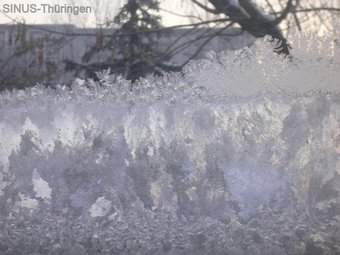 Das Bild zeigt Eisblumen an einer Fensterscheibe (Einfachverglasung). Es gelten die Nutzungsbedingungen der Mediothek und Pixiothek.