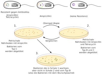Selektion der korrekten genetisch veränderten Bakterien mittels zweier Antibiotika (Amp, Tet).