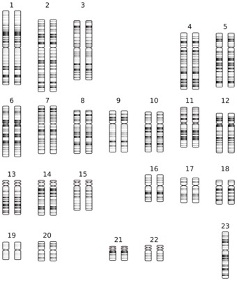 Karyogramm einer Frau mit Turner-Syndrom / Monosomie X. Es gelten die Nutzungsbedingungen der Mediothek und Pixiothek. Auf http://unterricht.petzinger.net/biochdropbox.html auch als svg und in CC-BY verfügbar.