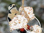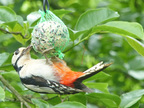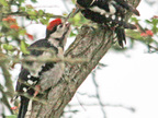 Buntspecht, Altvogel füttert Jungvogel