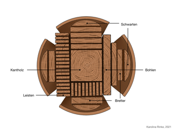 Die Grafik gehört zur Serie "Holzbearbeitung". Dargestellt sind Arten von Schnittholz, die in einem Sägewerk aus einem Baumstamm hergestellt werden, Bild-Variante: farbig, mit Beschriftung. Es gelten die Nutzungsbedingungen der Mediothek und Pixiothek.