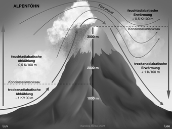 Das Bild gehört zur Serie "Grafische Darstellung Alpenföhn". Das Bild verdeutlicht den Alpenföhn (Föhnwind des Alpenraumes). Bild-Variante: Berg mit Wolken und Niederschlag; s/w; beschriftet. Es gelten die Nutzungsbedingungen der Mediothek und Pixiothek.