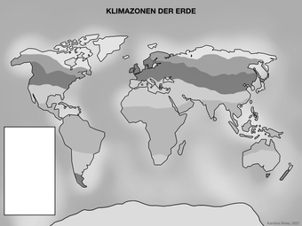 Das Bild verdeutlicht die Lage der Klimazonen der Erde. Bild-Variante: s/w; unbeschriftet; leeres Textfeld. Es gelten die Nutzungsbedingungen der Mediothek und Pixiothek.