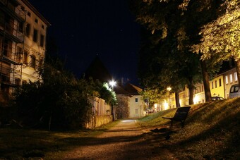 Motiv eines Stadtrundganges durch Pößneck (Ostthüringen) bei Nacht. Abgebildet ist der Blick über den Oberen Graben zum Pulverturm. Es gelten die Nutzungsbedingungen der Mediothek und Pixiothek.