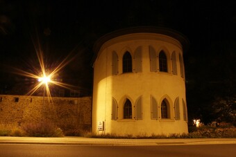 Motiv eines Stadtrundganges durch Pößneck (Ostthüringen) bei Nacht. Blick auf den Glockentum am Busbahnhof. Es gelten die Nutzungsbedingungen der Mediothek und Pixiothek.
