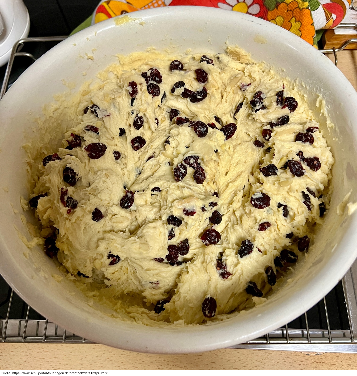 Das Bild zeigt eine Bearbeitungsstufe beim Backen eines Weihnachtsstollens bzw. Christstollens. Es gelten die Nutzungsbedingungen der Mediothek und Pixiothek.
