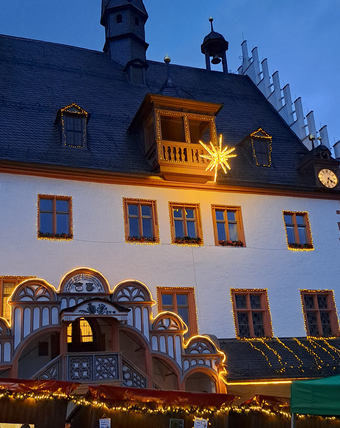 Das Foto gehört zur Serie "Weihnacht". Es zeigt die Weihnachtsdekoration am Rathaus von Pößneck. Es gelten die Nutzungsbedingungen der Mediothek und Pixiothek.