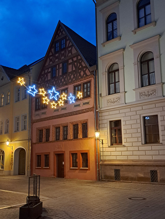 Das Foto gehört zur Serie "Weihnacht". Es zeigt eine weihnachtliche Lichterkette in Pößneck. Es gelten die Nutzungsbedingungen der Mediothek und Pixiothek.