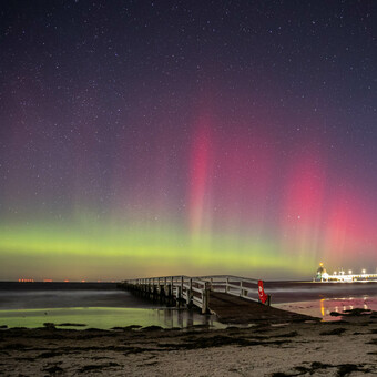 Das Bild gehört zur Serie „Polarlichter 2023 Zingst“. Es zeigt Polarlichter, die in der Nacht vom 26. Auf den 27. Februar 2023 gegen 0:30 in Zingst auf dem Darß mit einer Canon EOS RP aufgenommen wurden. Die Kameraeinstellungen: ISO 1600; Blende 2,8; 15 Sekunden Belichtung; manueller Modus. Mit bloßem Auge waren die Polarlichter in dieser Nacht deutlich zu sehen, aber natürlich nicht so farbenfroh wie auf dem Foto. Es gelten die Nutzungsbedingungen der Mediothek und Pixiothek.