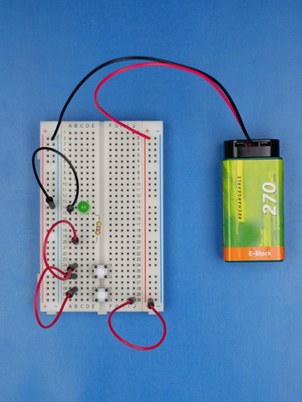 Das Bild zeigt einen, auf einem sogenannten Breadboard realisierten, Schaltkreis mit einer LED, passendem Vorwiderstand sowie 2 in Reihe liegenden Tastern zur Aktivierung der LED.