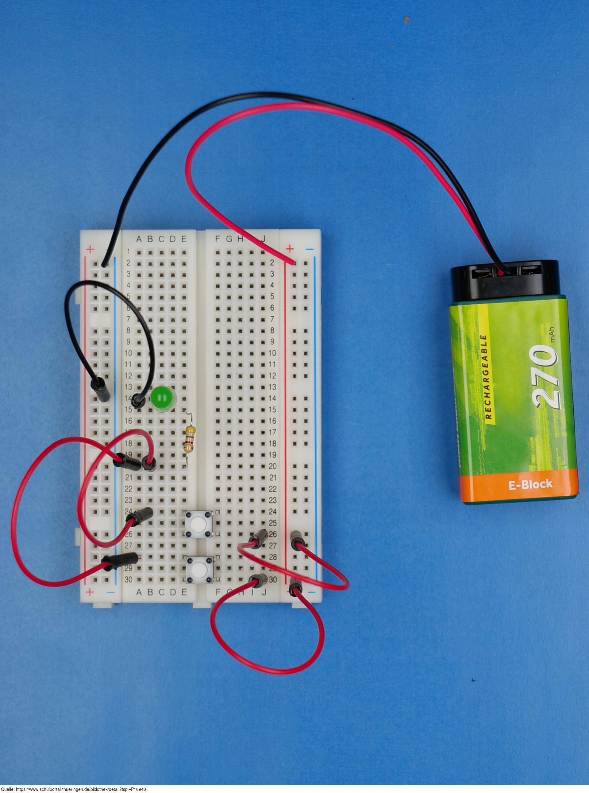 Die Schaltung realisiert eine logische ODER-Verknüpfung der Zustände der beiden Taster. Sobald einer der beiden Taster gedrückt wird, leuchtet die LED - auch wenn beide Taster gleichzeitig gedrückt werden. Es gelten die Nutzungsbedingungen der Mediothek und Pixiothek.