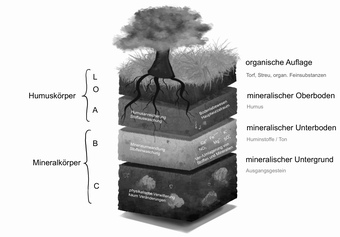 Das Bild verdeutlicht den typischen Aufbau des Bodens und die Zusammensetzung der jeweiligen Bodenhorizonte. Variante: s/w; beschriftet. Es gelten die Nutzungsbedingungen der Mediothek und Pixiothek.
