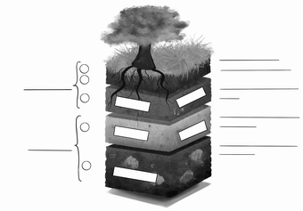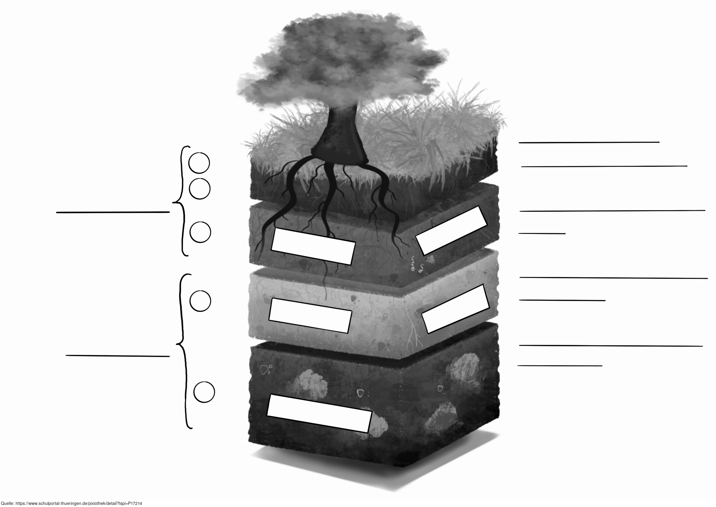 Das Bild verdeutlicht den typischen Aufbau des Bodens und die Zusammensetzung der jeweiligen Bodenhorizonte. Variante: s/w; unbeschriftet. Es gelten die Nutzungsbedingungen der Mediothek und Pixiothek.