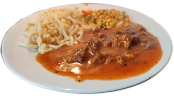 Das Bild zeigt ein Tellergericht mit Nudeln bzw. Spätzle, Mischgemüse, Gulasch und Tomatensoße.. Es gelten die Nutzungsbedingungen der Mediothek und Pixiothek.