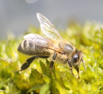 Das Bild gehört zur Serie "Saalfelder Honig", aufgenommen vom Imker Bernd Rümpler, Inhaber von saalfelder-honig.de. Zu sehen ist eine Honigbiene (Flugbiene) auf Moos beim Aufnehmen von Wasser mit dem Rüssel.