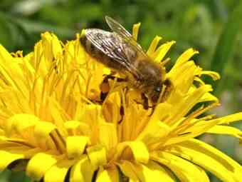 Das Bild gehört zur Serie "Saalfelder Honig", aufgenommen vom Imker Bernd Rümpler, Inhaber von saalfelder-honig.de. Zu sehen ist eine Honigbiene - Flugbiene- beim Sammeln auf einer Löwenzahnblüte. Die Biene klebt Pollen an ihre Hinterbeine, indem sie diesen mit körpereigenen Stoffen vermischt - Pollenhöschen. In ihrem Fell haften sich Pollenkörnchen an, durch welche dann auf der nächsten Blüte deren Befruchtung erfolgt. Mit dem Rüssel nimmt sie am Blütengrund Nektar auf und transportiert diesen im Honigmagen zum Bienenstock. Es gelten die Nutzungsbedingungen der Mediothek und Pixiothek.
