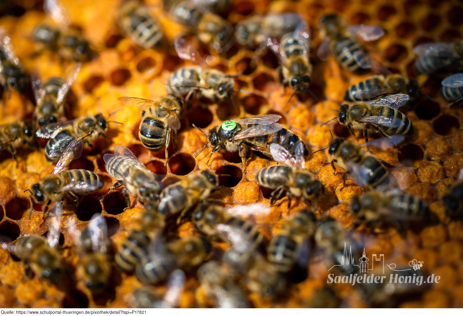 Das Bild gehört zur Serie "Saalfelder Honig", aufgenommen vom Imker Bernd Rümpler, Inhaber von saalfelder-honig.de. Zu sehen ist eine Bienenkönigin (gezeichnet) umringt von Arbeiterinnen (Stockbienen) bei der Eiablage. Es gelten die Nutzungsbedingungen der Mediothek und Pixiothek.