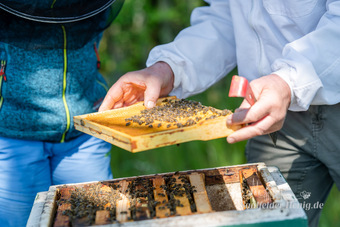 Das Bild gehört zur Serie "Saalfelder Honig", aufgenommen vom Imker Bernd Rümpler, Inhaber von saalfelder-honig.de. Zu sehen ist ein Imker am geöffneten Bienenvolk mit gezogener Wabe. Es gelten die Nutzungsbedingungen der Mediothek und Pixiothek.