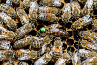 Das Bild gehört zur Serie "Saalfelder Honig", aufgenommen vom Imker Bernd Rümpler, Inhaber von saalfelder-honig.de. Zu sehen ist eine Bienenkönigin (gezeichnet) umringt von Arbeiterinnen (Stockbienen) auf der Suche nach geputzten Zelle, in welche sie jeweils ein Ei ablegen kann. Es gelten die Nutzungsbedingungen der Mediothek und Pixiothek.