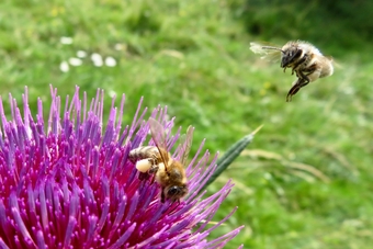 Das Bild gehört zur Serie "Saalfelder Honig", aufgenommen vom Imker Bernd Rümpler, Inhaber von saalfelder-honig.de. Zu sehen ist eine Flugbiene beim Sammeln von Nektar und Pollen auf der Blüte einer Kugeldistel und eine weitere Biene im Anflug. Es gelten die Nutzungsbedingungen der Mediothek und Pixiothek.