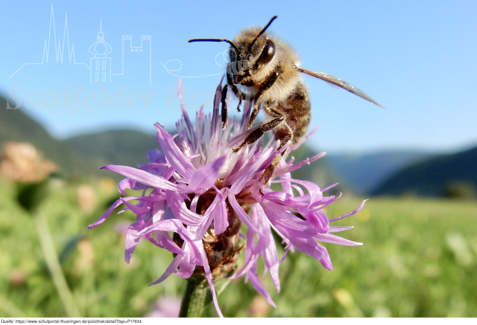 Das Bild gehört zur Serie "Saalfelder Honig", aufgenommen vom Imker Bernd Rümpler, Inhaber von saalfelder-honig.de. Zu sehen ist eine Flugbiene auf einer Kornblume. Es gelten die Nutzungsbedingungen der Mediothek und Pixiothek.