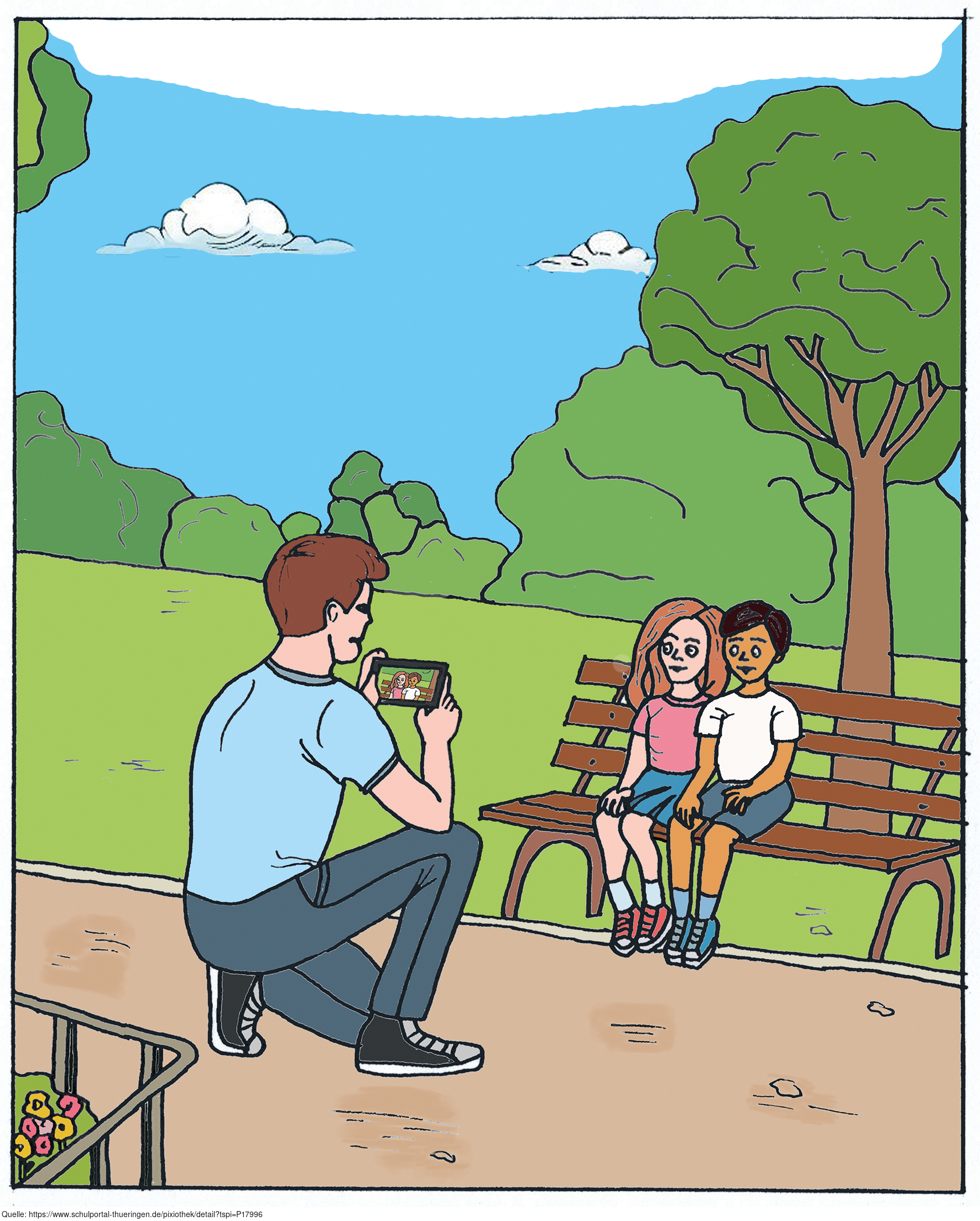 Das Bild zeigt einen Vater, der seine beiden Kinder mit einem Handy fotografiert. Das Bild kann als Teil einer Bildergeschichte verwendet werden - siehe Funktionslink "Weitere Bilder der Serie". Es gelten die Nutzungsbedingungen der Mediothek und Pixiothek.