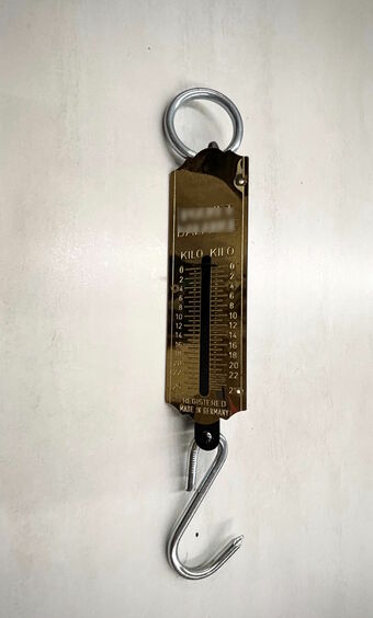 Das Bild zeigt eine Federzugwaage bis 25 Kg Gewicht oder Zugkraft. Sie arbeitet mit einer eingebauten Feder, die sich proportional zur aufgebrachten Last ausdehnt. Das kompakte, auch Taschenfederwaage genannte Werkzeug, ist leicht zu transportieren, robust, einfach zu bedienen und arbeitet ohne Batterien. Es eignet sich zum Wiegen kleinerer Objekte wie z. B. Paketen, Koffern, Bauteilen, kleineren Tieren usw. oder für physikalische Experimente zur Zugkraft.