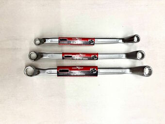 Das Bild zeigt 3 Ringschlüssel mit je 2 verschiedenen Größen an einem Werkzeug. Diese Kombinationsschlüssel passen zu verschiedenen Standardgrößen von kleinen Sechskantmuttern oder -schrauben. Hier sind es die Schlüsselweiten 8,9,10,11,12 und 13 mm. Die Ringschlüssel eignen sich besonders zum Anziehen oder Lösen von Muttern und Schrauben an kleineren Maschinen, Mopeds, Fahrrädern, Möbeln oder Haushaltsgeräten. Sie bieten guten Halt, da sie die Schraube oder Mutter vollständig umschließen, was das Risiko einer Beschädigung des Schraubkopfes verringert. Es gelten die Nutzungsbedingungen der Mediothek und Pixiothek.