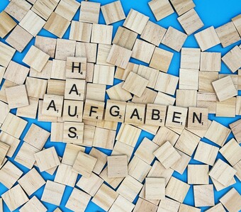Aus Buchstaben wurde das Wort "Hausaufgaben" gelegt. Es gelten die Nutzungsbedingungen der Mediothek und Pixiothek.
