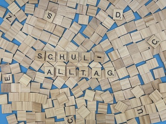 Aus Buchstaben wurde das Wort "Schulalltag" gelegt. Es gelten die Nutzungsbedingungen der Mediothek und Pixiothek.