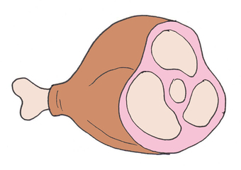 Das Bild zeigt ein gezeichnetes Stück Fleisch am Knochen (farbig). Es gehört zur Serie "Ernährungspyramide zum Basteln und Gestalten" und findet u.a. im gleichnamigen Lernobjekt unter https://www.schulportal-thueringen.de/web/guest/media/detail?tspi=18517 Verwendung. Es gelten die Nutzungsbedingungen der Mediothek und Pixiothek.