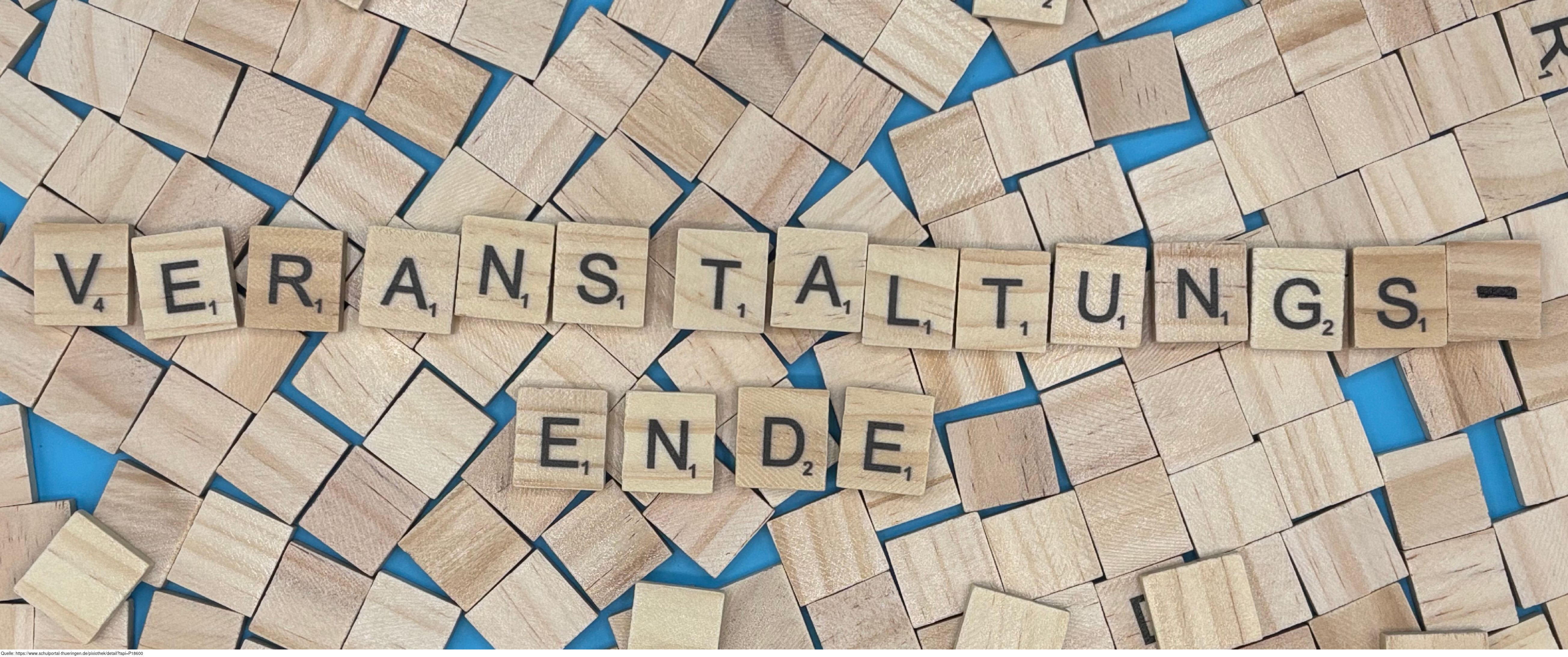 Aus Buchstaben wurde das Wort "Veranstaltungsende" gelegt. Es gelten die Nutzungsbedingungen der Mediothek und Pixiothek.