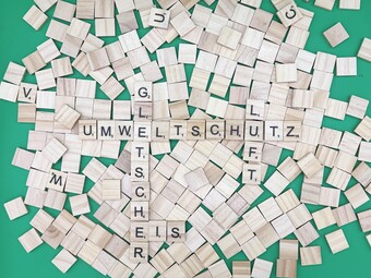 Aus Buchstaben wurden die Begriffe "Umweltschutz", "Gletscher", "Eis" und "Luft" gelegt. Es gelten die Nutzungsbedingungen der Mediothek und Pixiothek.