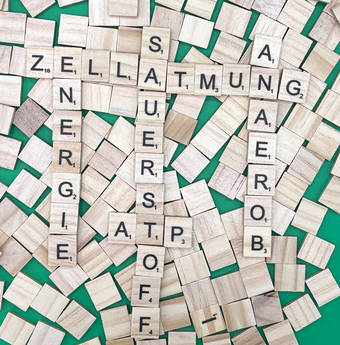 Aus Buchstaben wurden die Begriffe "Zellatmung", "Energie", "Sauerstoff", "ATP" und "anaerob" gelegt. Es gelten die Nutzungsbedingungen der Mediothek und Pixiothek.
